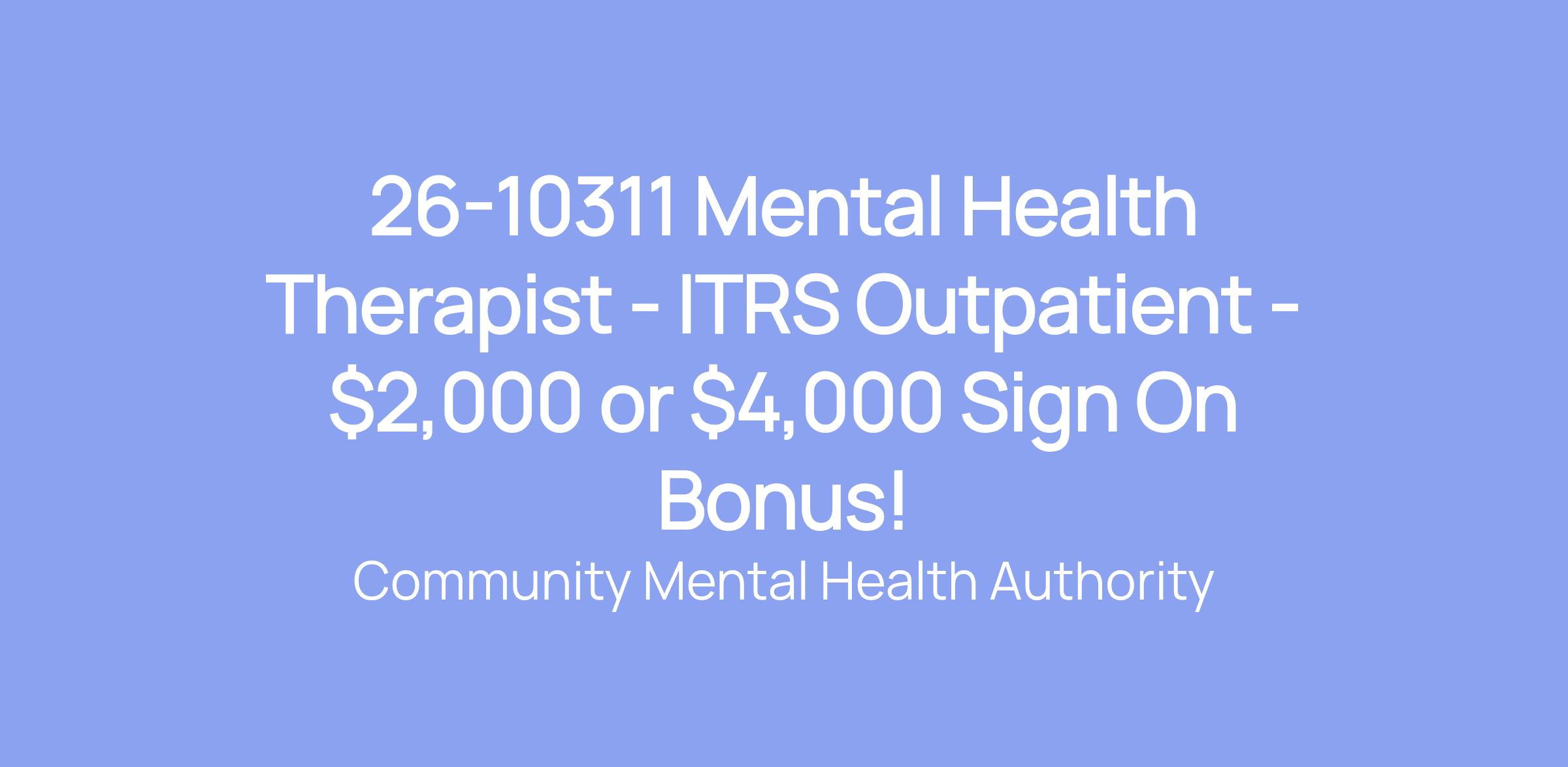 26-10311 Mental Health Therapist - ITRS Outpatient - $2,000 or $4,000 Sign On Bonus!