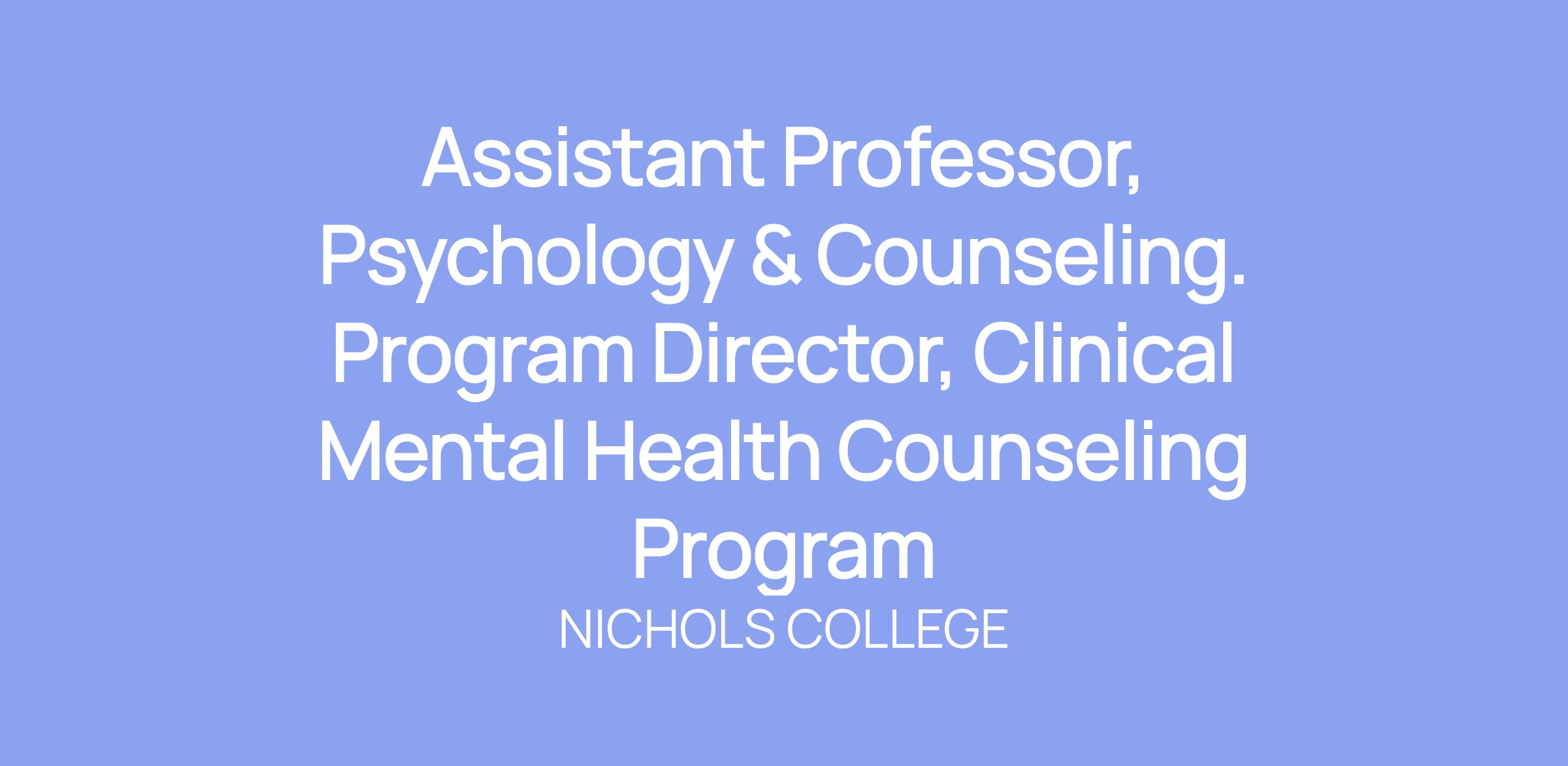 Nichols College is seeking an Assistant Professor in Psychology and Counseling and Program Director for its newly approved Clinical Mental Health Counseling Program.  This is a three-year renewable appointment with the opportunity to transfer to the tenure track in the third year.