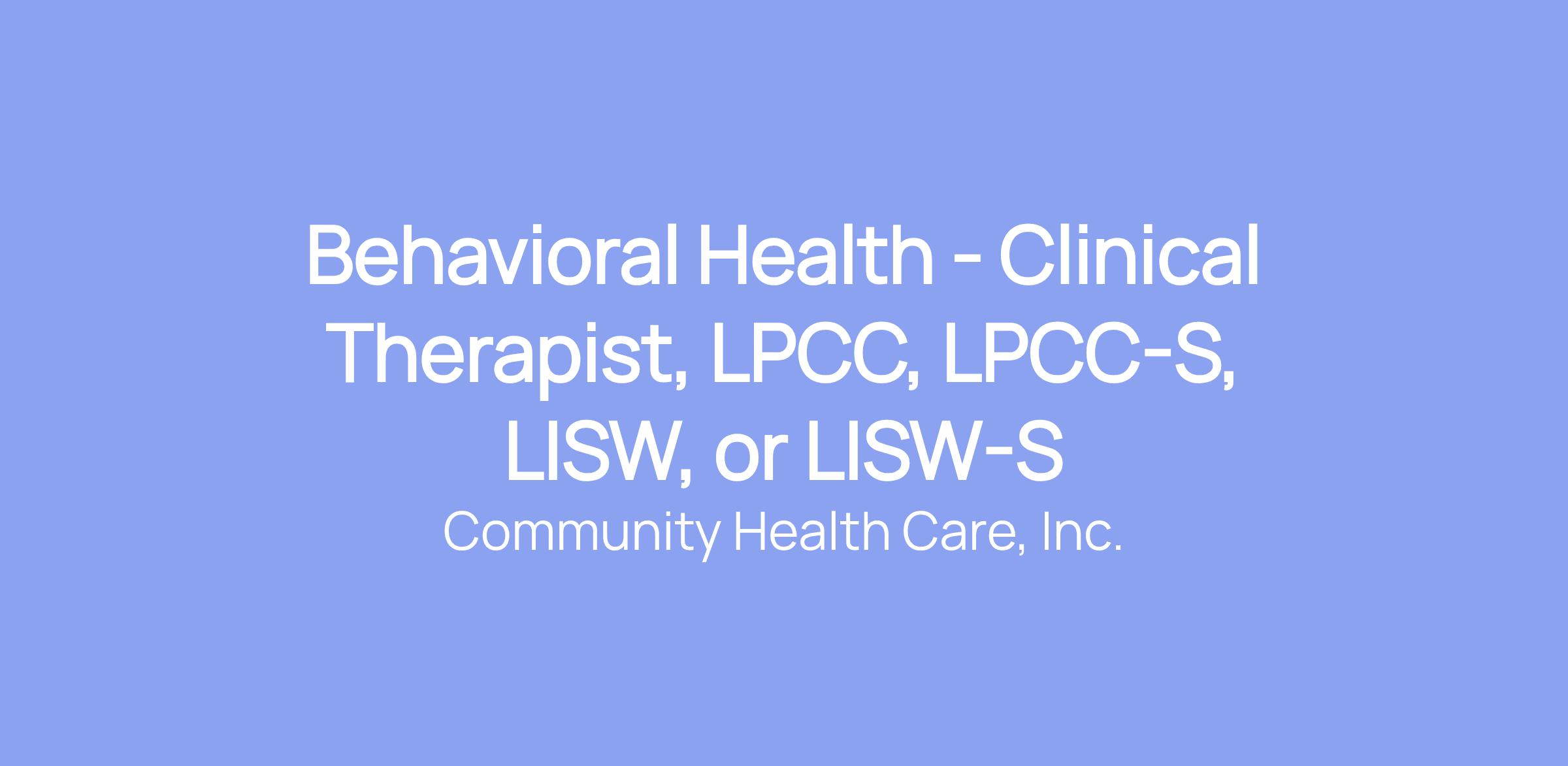 Behavioral Health - Clinical Therapist, LPCC, LPCC-S, LISW, or LISW-S