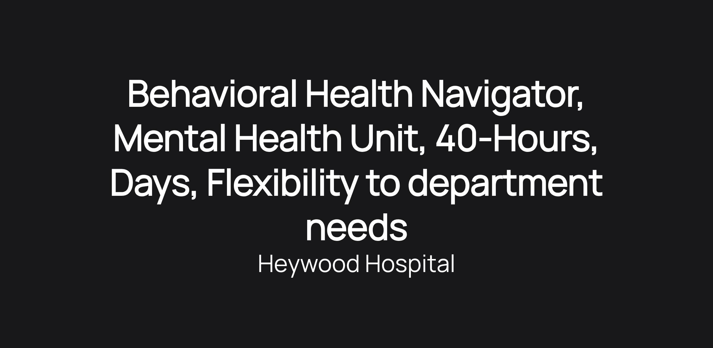 Behavioral Health Navigator, Mental Health Unit, 40-Hours, Days, Flexibility to department needs