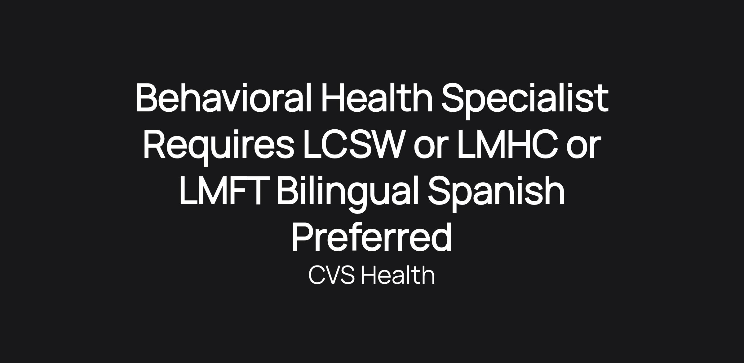 Title: Behavioral Health Specialist - Requires LCSW, LMHC or LMFT - Bilingual Spanish Preferred