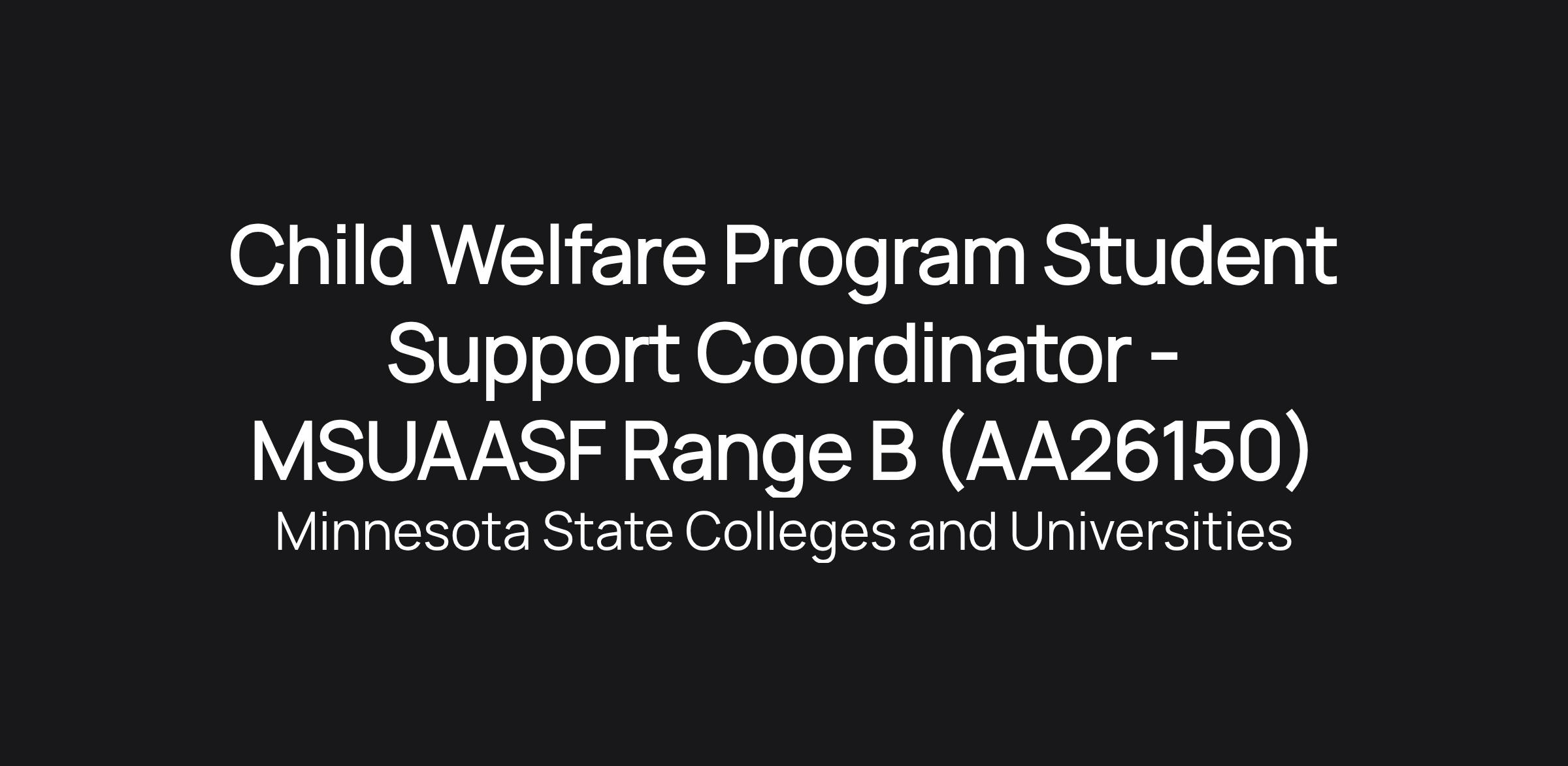 The Child Welfare Program Student Support Coordinator is a twelve month position and will be responsible for the implementation of the federal and state funded MSW and BSSW Title IV-E Child Welfare Program Training contract awarded by Minnesota Department of Human Services.