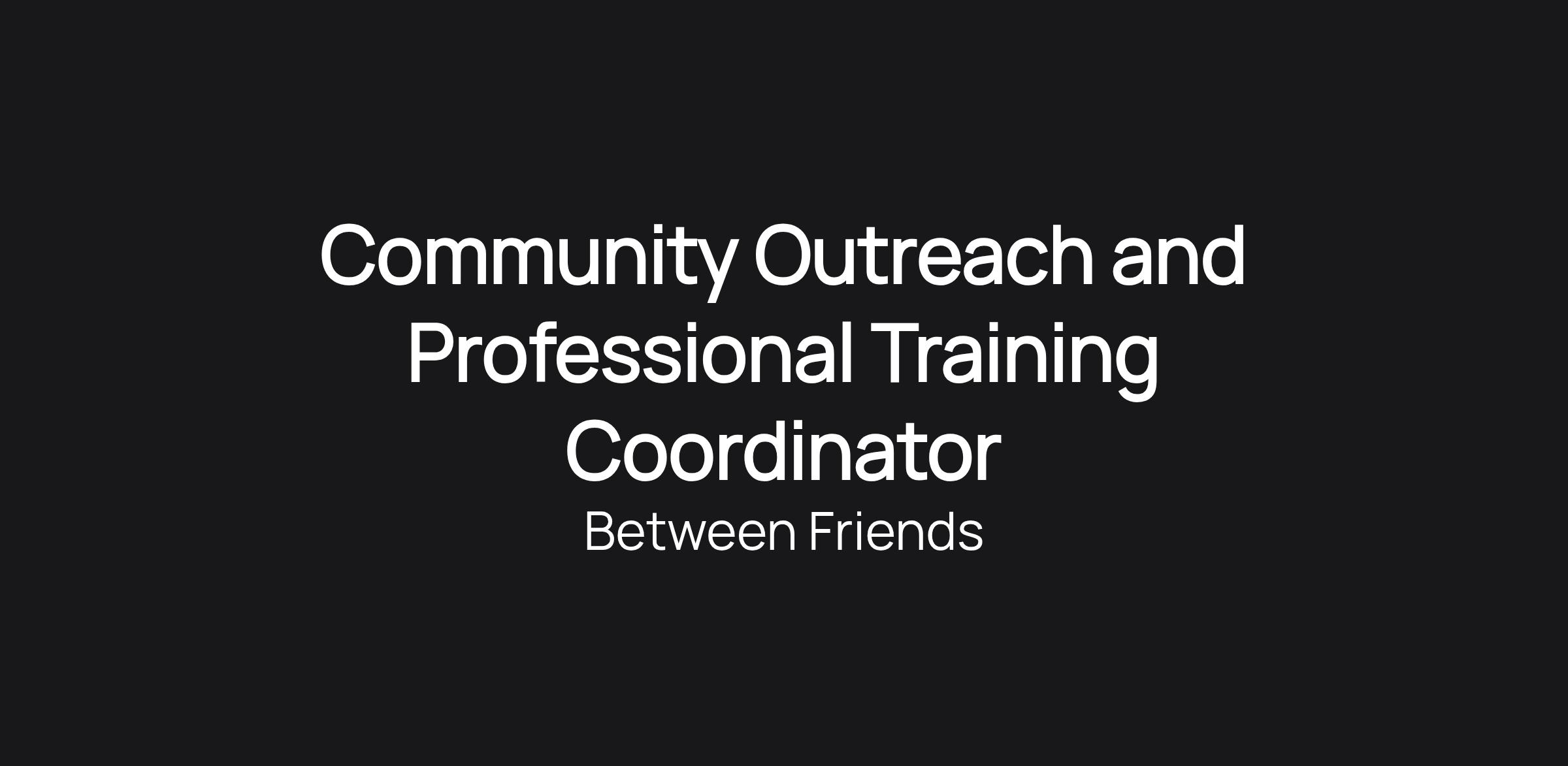 RESPONSIBILITIES: Outreach, Direct Service, and Programming (50%) The Community Outreach and Professional Training Coordinator will work as a member of Between Friends’ Prevention and Education (PE) Team, to develop and refine the protocols, policies, and programs our community partners are using to work with domestic violence survivors. This will be accomplished through: