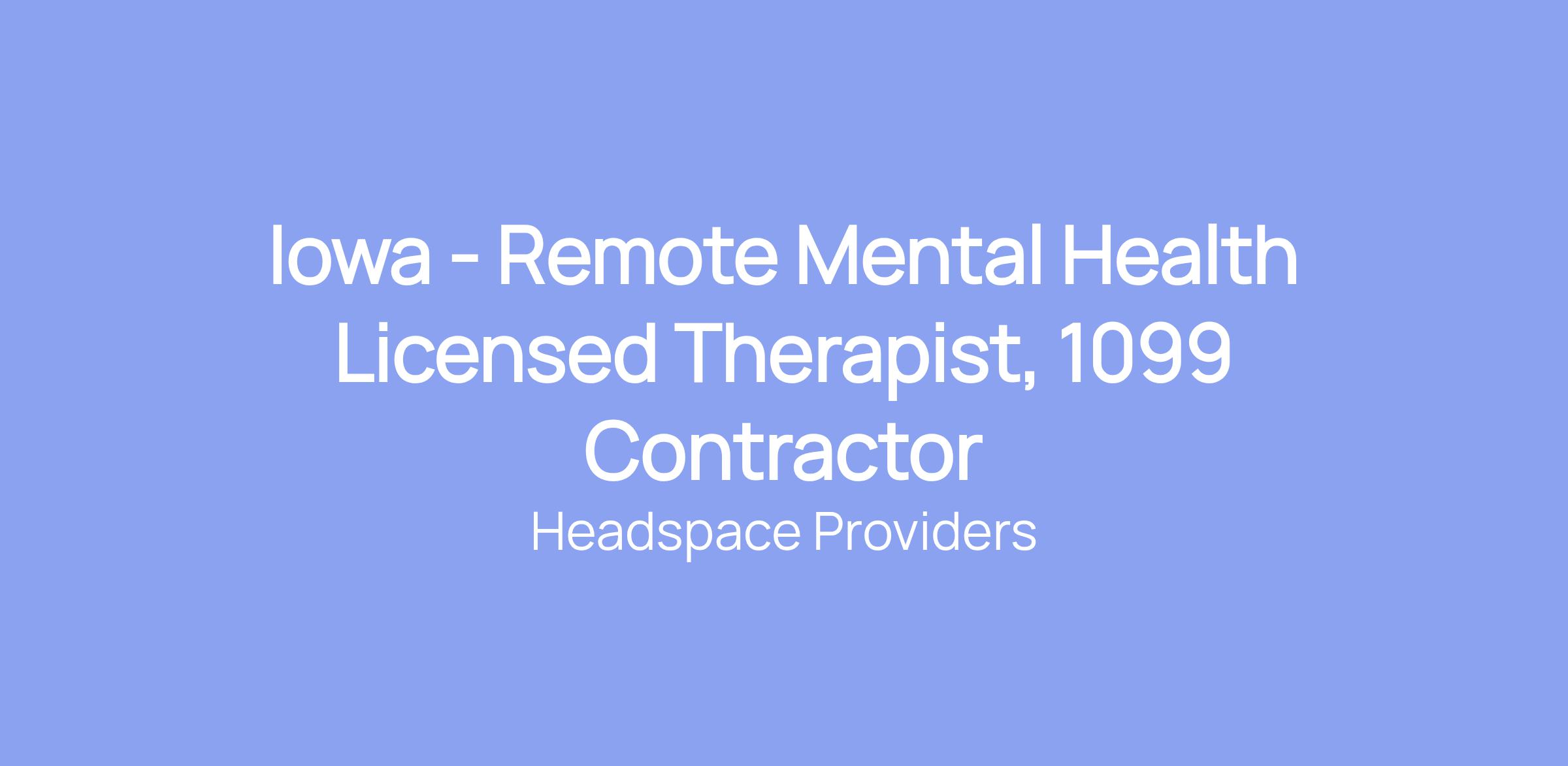 Headspace is currently seeking part-time, independently licensed contractor Iowa therapists to provide direct, virtual care as part of a multidisciplinary team on a 1099 contract basis.