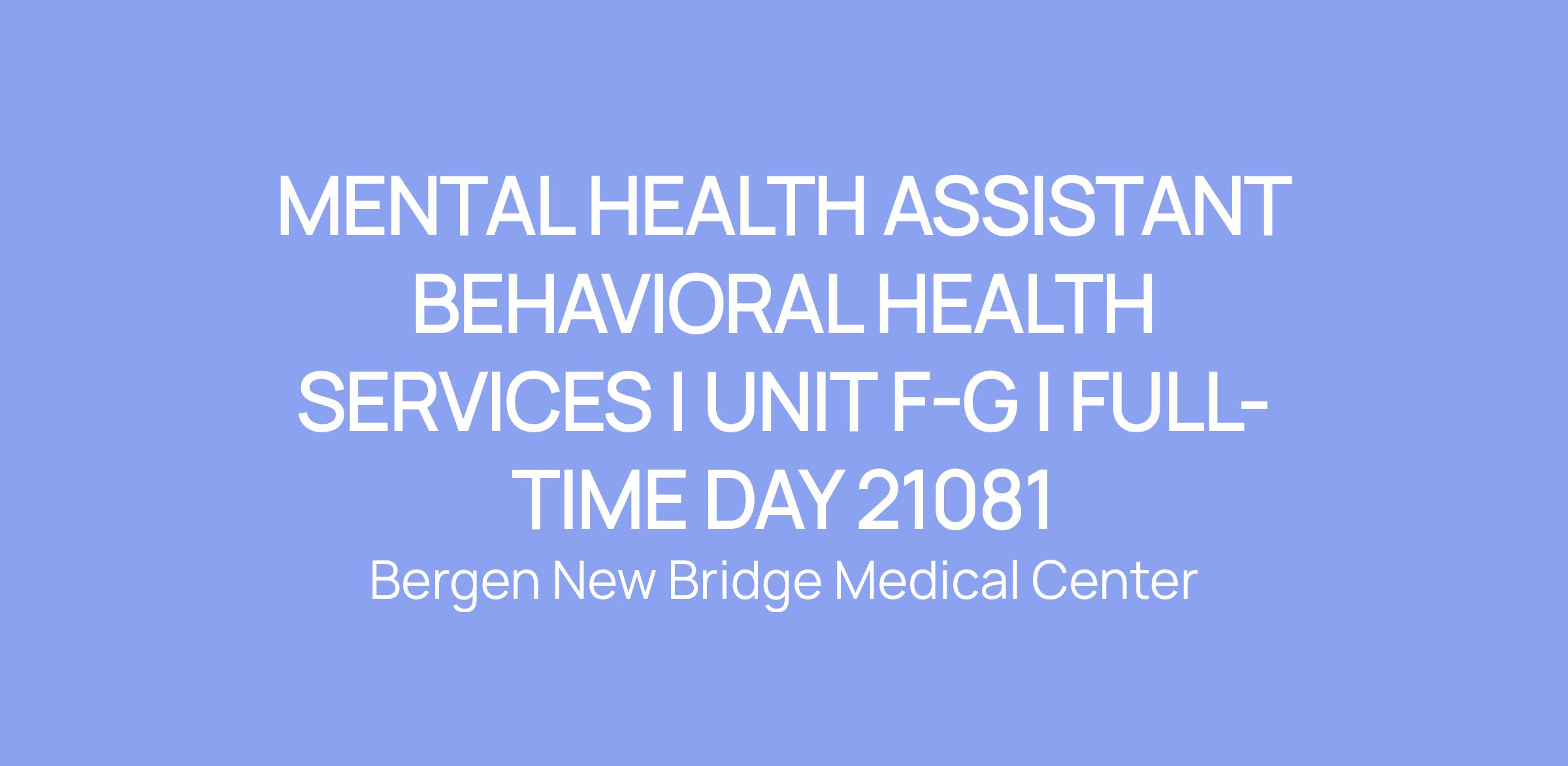 MENTAL HEALTH ASSISTANT BEHAVIORAL HEALTH SERVICES | UNIT F-G | FULL-TIME DAY 21081