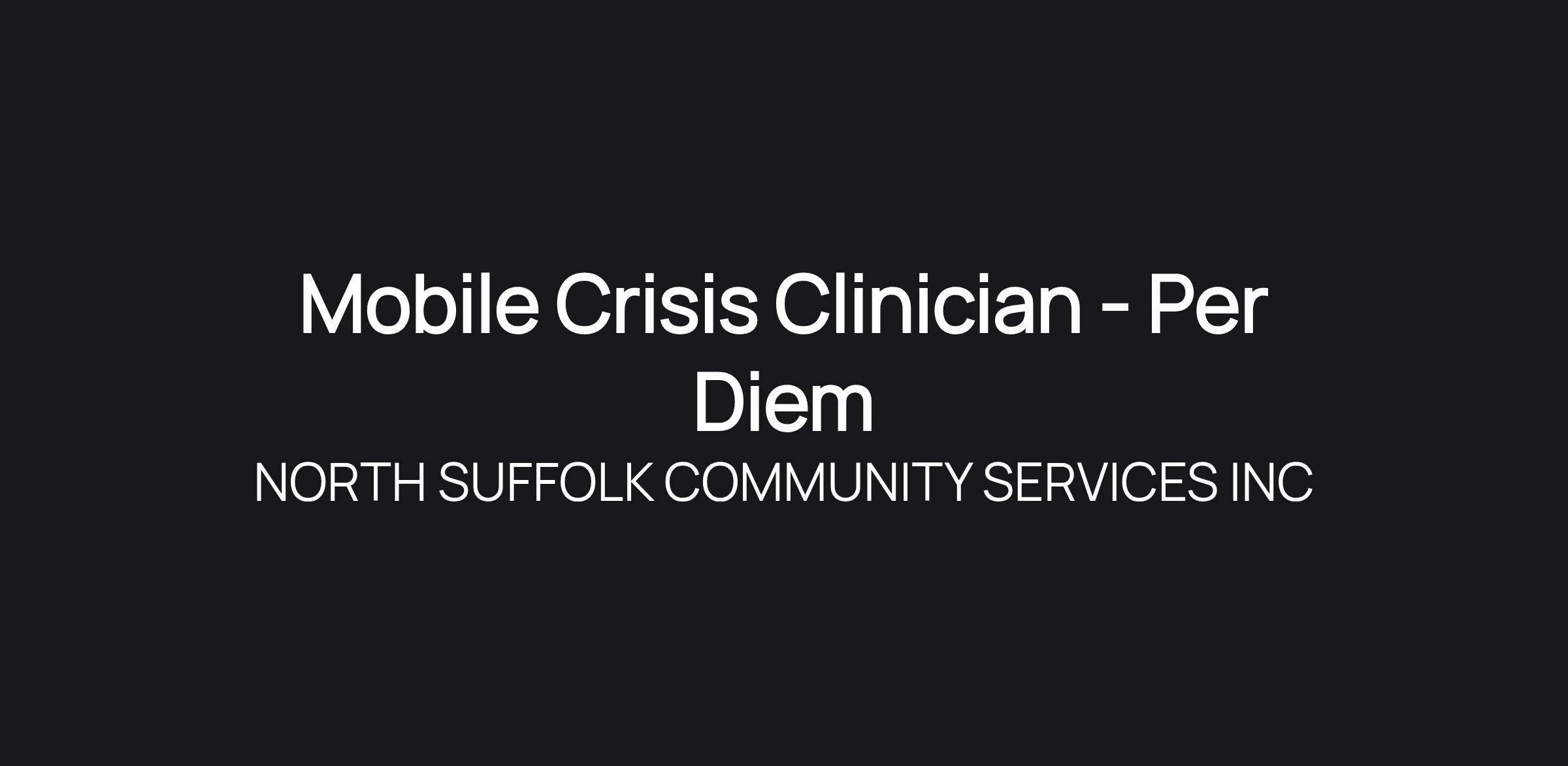 North Suffolk's Community Behavioral Health Center (CBHC) - Mobile Crisis Intervention Program is looking for a Mobile Crisis Clinician (Weekend and/or Overnight Per Diem) at our East Boston location! The Mobile Crisis Clinician provides direct emergency psychiatric clinical services to youth and their families and coordination/consultation to other care providers also involved, in collaboration with other emergency services staff.