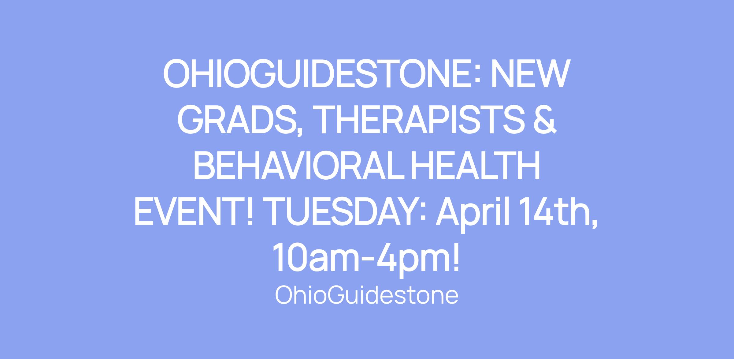 OHIOGUIDESTONE: NEW GRADS, THERAPISTS & BEHAVIORAL HEALTH EVENT! TUESDAY: April 14th, 10am-4pm!
