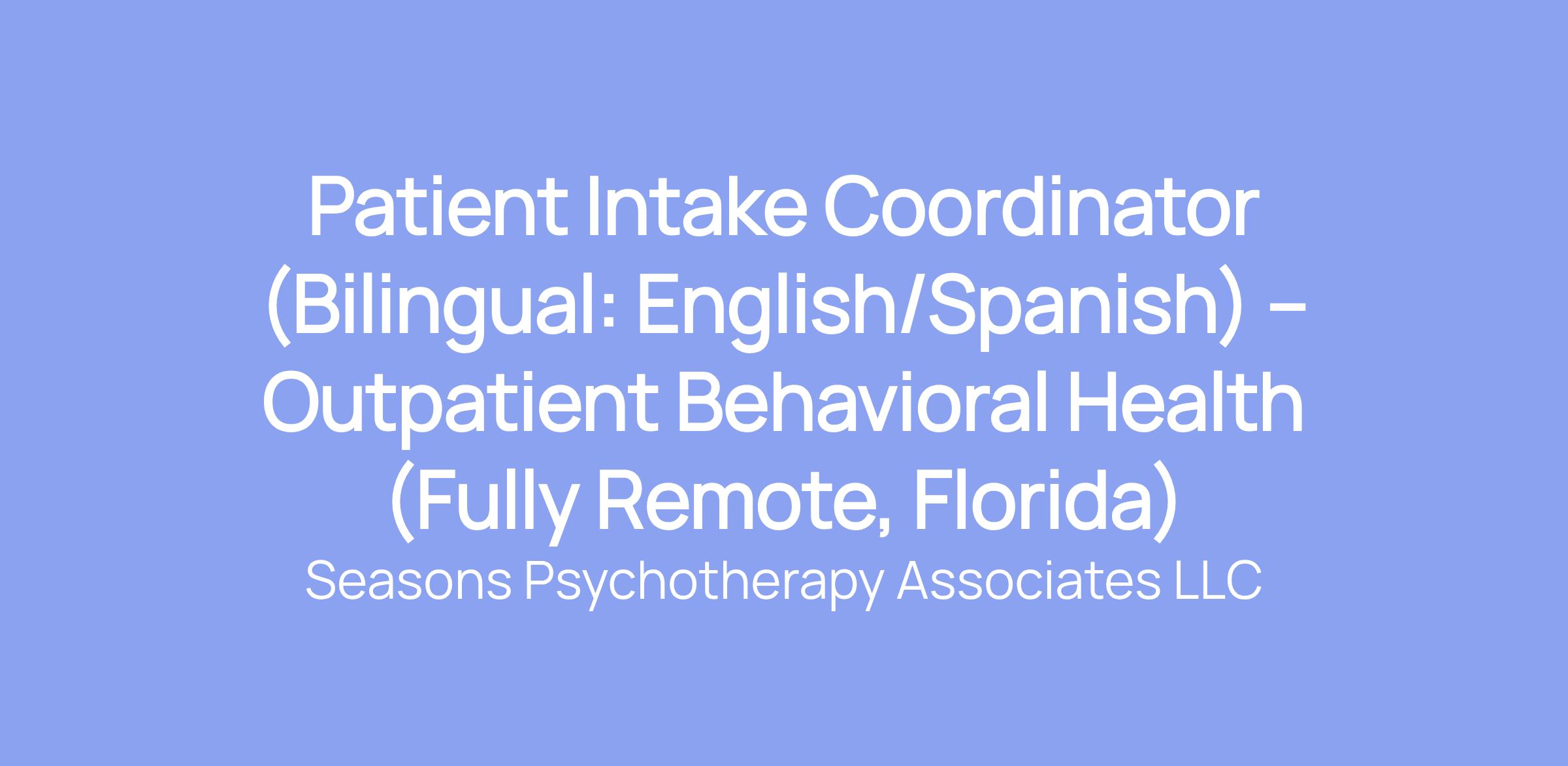 Patient Intake Coordinator (Bilingual: English/Spanish) – Outpatient Behavioral Health (Fully Remote, Florida)
