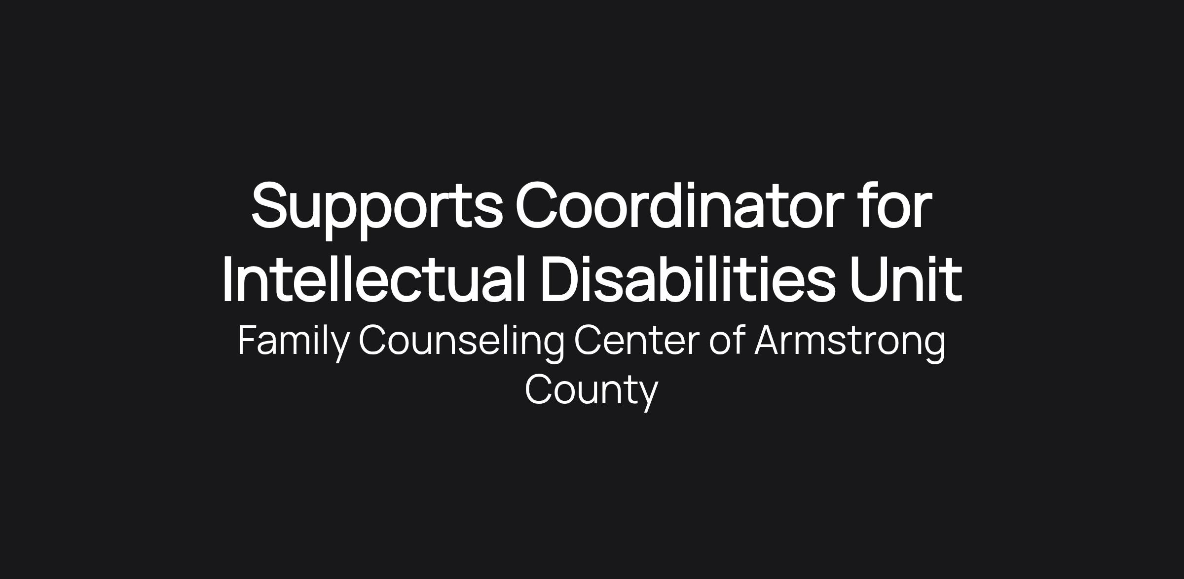 Supports Coordinator for Intellectual Disabilities Unit: Bachelor's degree required in psychology, sociology, social work, or other related field. Position includes maintaining Individual Support Plans, coordinating services, and completing face to face monitoring with consumers. Experience preferred with individuals with intellectual disabilities and/or Autism. Salary $ 40,000 with excellent benefits. E.O.E. Resumes may be submitted through the Indeed website or mailed to Executive Director, Family Counseling Center of Armstrong Co, 300 South Jefferson Street, Kittanning, PA 16201